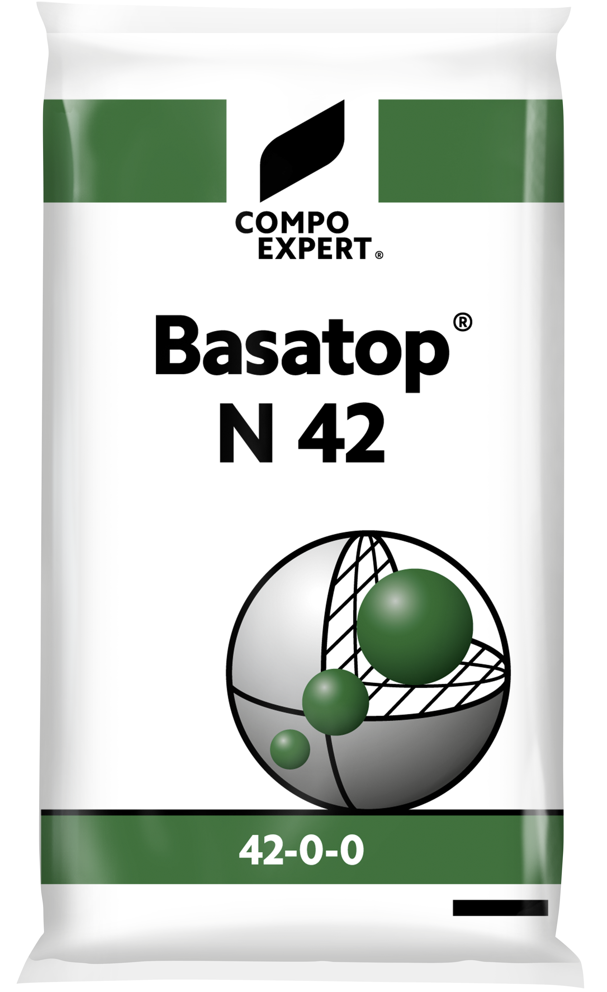 Basatop N 42 ist ein Stickstoff-Langzeitdünger auf Basis hochwertigem Hüllmaterial. Die Nährstoff- Freisetzung erfolgt in zwei Stufen. Nach dem Streuen und unter Einwirken von Feuchtigkeit beginnt die Startwirkung, so dass die Pflanzen sofort mit Stickstoff versorgt werden. Danach beginnt die Langzeitwirkung aus den umhüllten Körnern zur Deckung des Nährstoff-Folgebedarfs. Der Stickstoff durchdringt die Hülle kontinuierlich in Abhängigkeit von Feuchtigkeit und Temperatur. Durch diese kontinuierliche Anlieferung werden evtl. Auswaschungsverluste weitestgehend verhindert. Unter normalen Witterungsbedingungen hält aufgrund des hohen Anteils des umhüllten Stickstoffs von 80 % der Stickstofffluss 3 bis 4 Monate an. Bei niedrigen Temperaturen (unter 10 °C) hört die Nährstoff-Nachlieferung auf und die Wirkungsdauer verlängert sich. Auch Trockenheit unterbindet die Nährstoff-Freisetzung, so dass die Versorgung der Pflanzen im Einklang mit den biologischen Wachstumsfaktoren stattfindet.