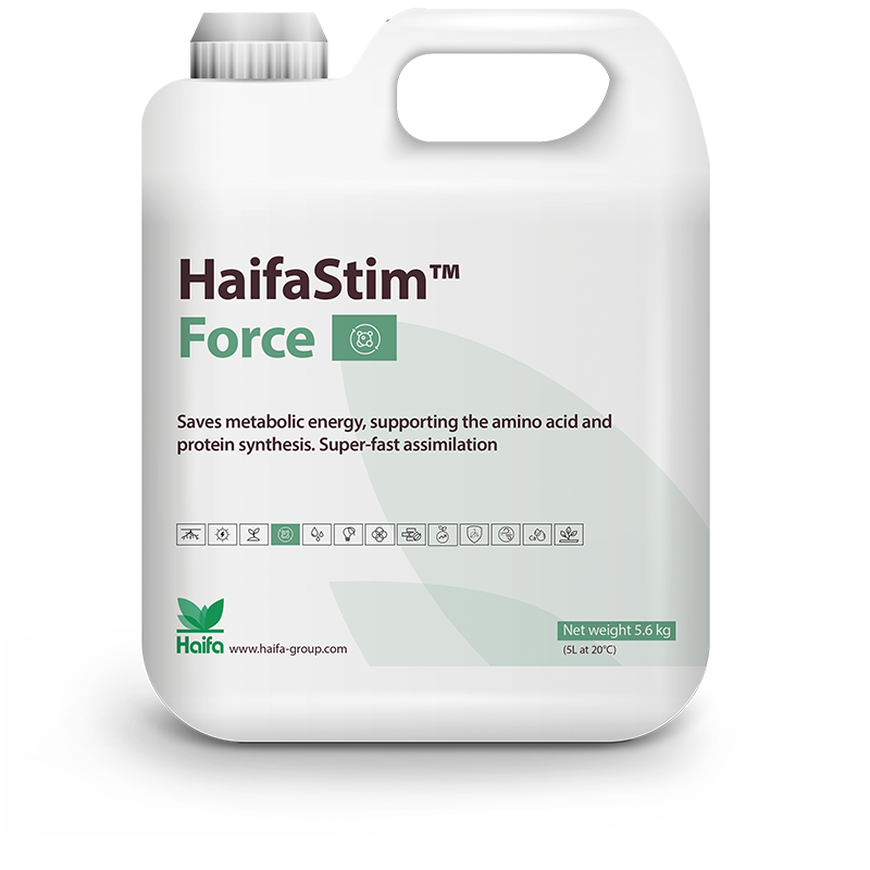 HaifaStim™ Force ist eine Biostimulanz mit einer höchst wirksamen Wirkstoffkombination, die alle pflanzenphysiologischen Funktionen beeinflusst und verbessert. Reich an 18 freien L-Aminosäuren & Peptiden, Polysacchariden, osmolyten (Betain und Mannitol) und Phytohormonen.