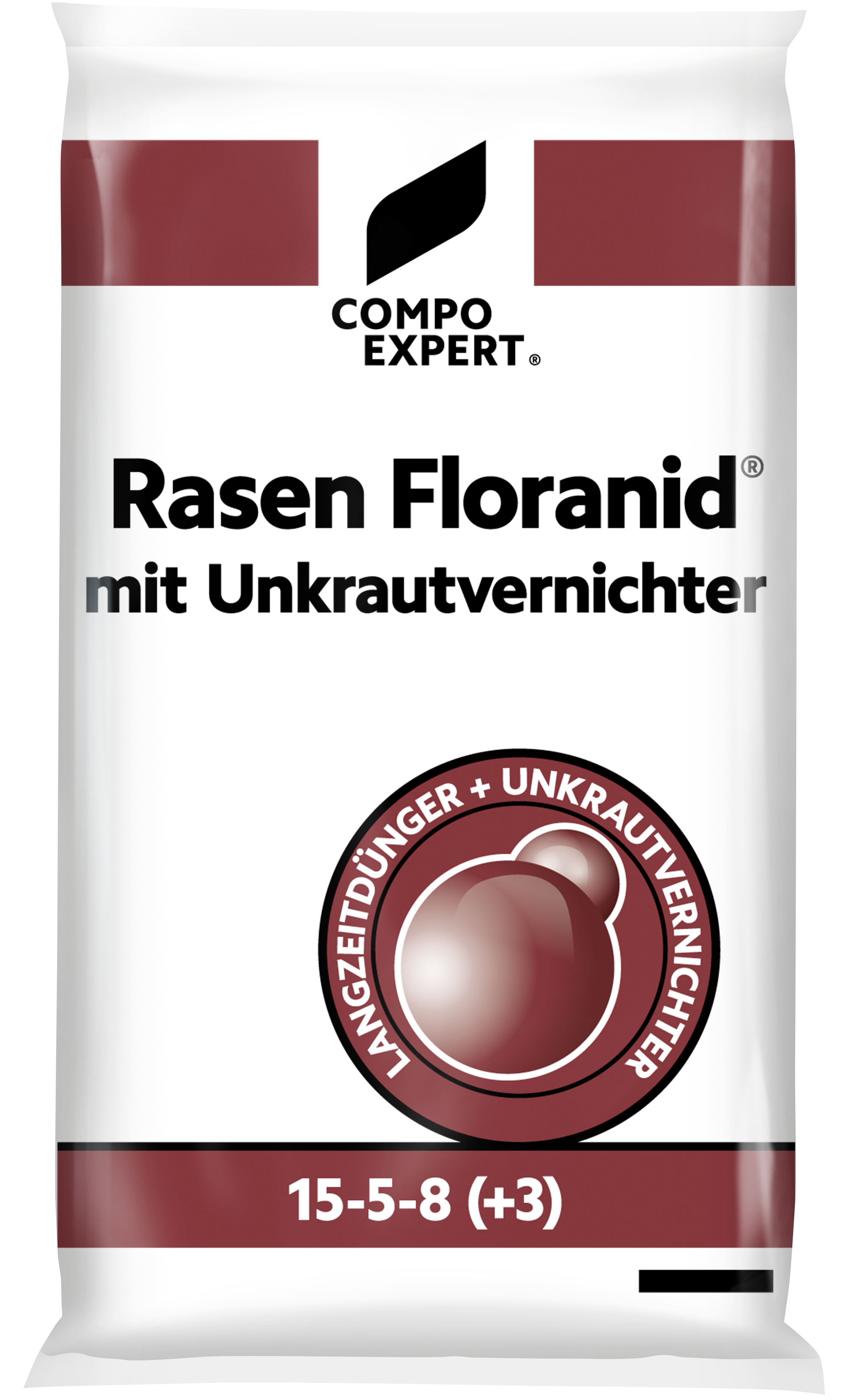 Rasen Floranid® mit Unkrautvernichter 15-5-8(+3) ist ein Kombinationsdünger von Haupt- und Spurennährstoffen mit herbiziden Wirkstoffen. Der Langzeitstickstoff wird dosiert und pflanzenschonend im Laufe vieler Wochen freigesetzt und dient so der Langzeitversorgung mit Stickstoff. Er sorgt für eine unkrautfreie, dichte und strapazierfähige Grasnarbe, weil gut ernährte Gräser die durch absterbendes Unkraut hervorgerufenen Lücken rasch schließen können. So entstehen bei normaler Verunkrautung keine störenden Kahlstellen im Rasen. Die herbiziden Wirkstoffe 2,4-D und Dicamba beeinflussen bei vorschriftsmäßiger Aufwandmenge aufgrund ihrer selektiven Wirkung die Gräser nicht. Sie bringen jedoch Unkräuter durch übersteigertes Wachstum zum Absterben. 2,4-D wirkt