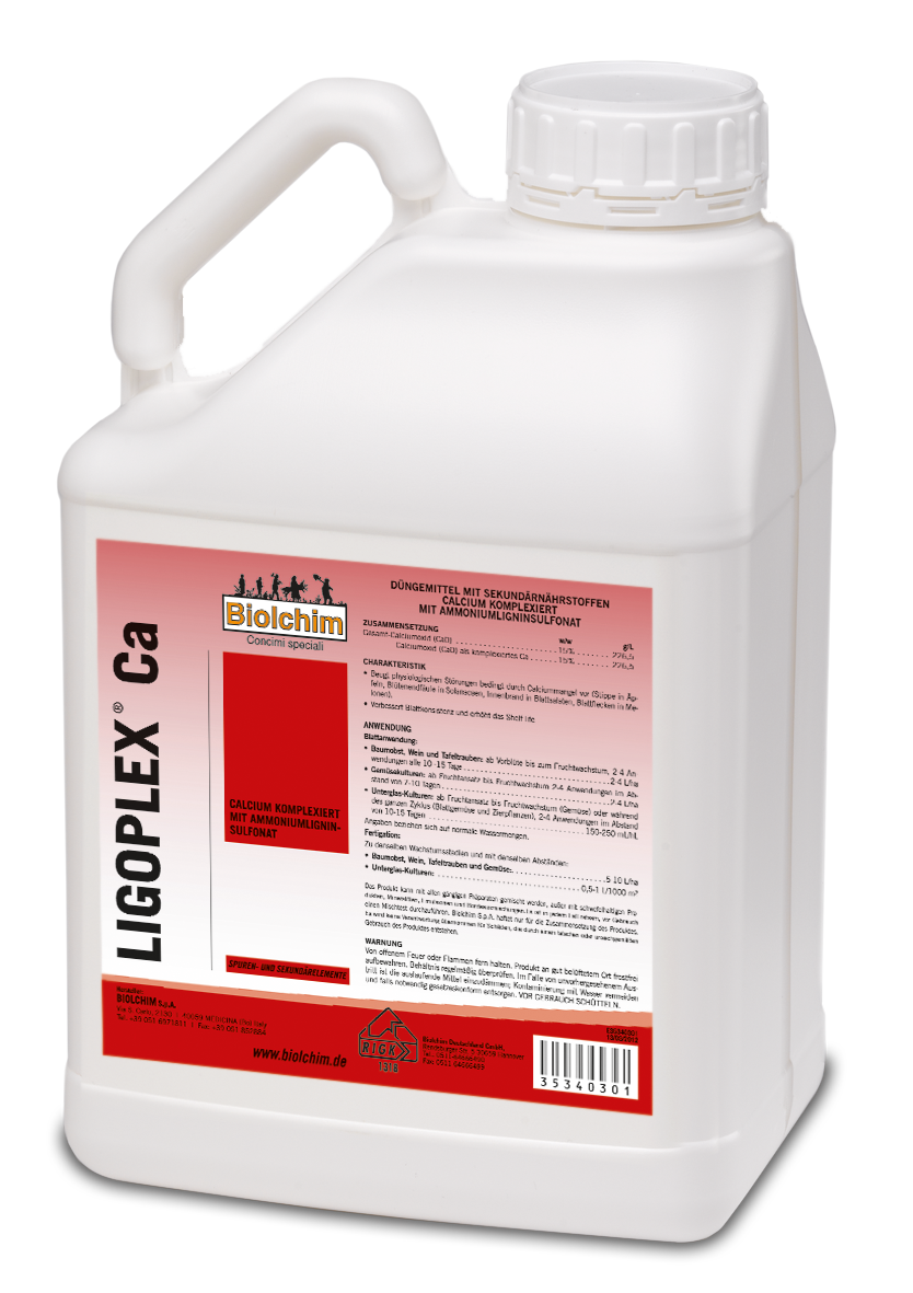 Ligoplex Ca ist ein Flüssigdünger mit 15% CaO, der als Ligninsulfonat komplexiert ist. Ligoplex Ca ist sehr gut löslich und schnell verfügbar und ist ideal für die Blattdüngung in allen calciumbedürftigen Kulturen.