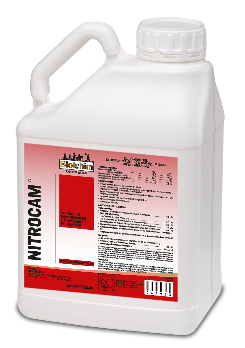 Nitrocam ist ein speziell formulierter Flüssigdünger mit 9% N, 10% CaO und 5% MgO. Außerdem ist das für die Chlorophyllbildung wichtige Spurenelement Molybdän enthalten. Der Spezialdünger Nitrocam hat sich sowohl zur Blattdüngung, als auch zur Fertigation v.a. in Erdbeeren ausgezeichnet bewährt.