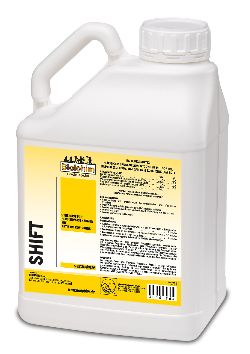 Shift ist ein Spezialdünger mit biostimulativer Wirkung. Neben Aminosäuren und Spurenelementen enthält Shift das pflanzliche Hormon Zeatin, das zu den Zytokininen gehört. Zeatin ist beteiligt an der pflanzlichen Embryonalentwicklung und stimuliert die Entwicklung der Seitentriebe. In Getreide führt dies zu einer besseren Bestockung. Außerdem enthält Shift Biotenside, die für eine optimale Verteilung von in Kombination ausgebrachten PSM sorgen und dessen Effizienz steigern.