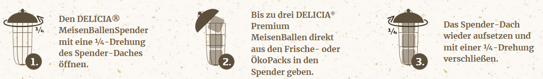 Dank des DELICIA® MeisenBallenSpenders ist die Futterstelle bereits ausreichend witterungsgeschützt. Berücksichtigen Sie bei der Platzierung des Spenders möglichst, dass der Zugriff durch natürliche Fressfeinde Ihrer Gartenvögel (z.B. Katzen) verhindert wird.