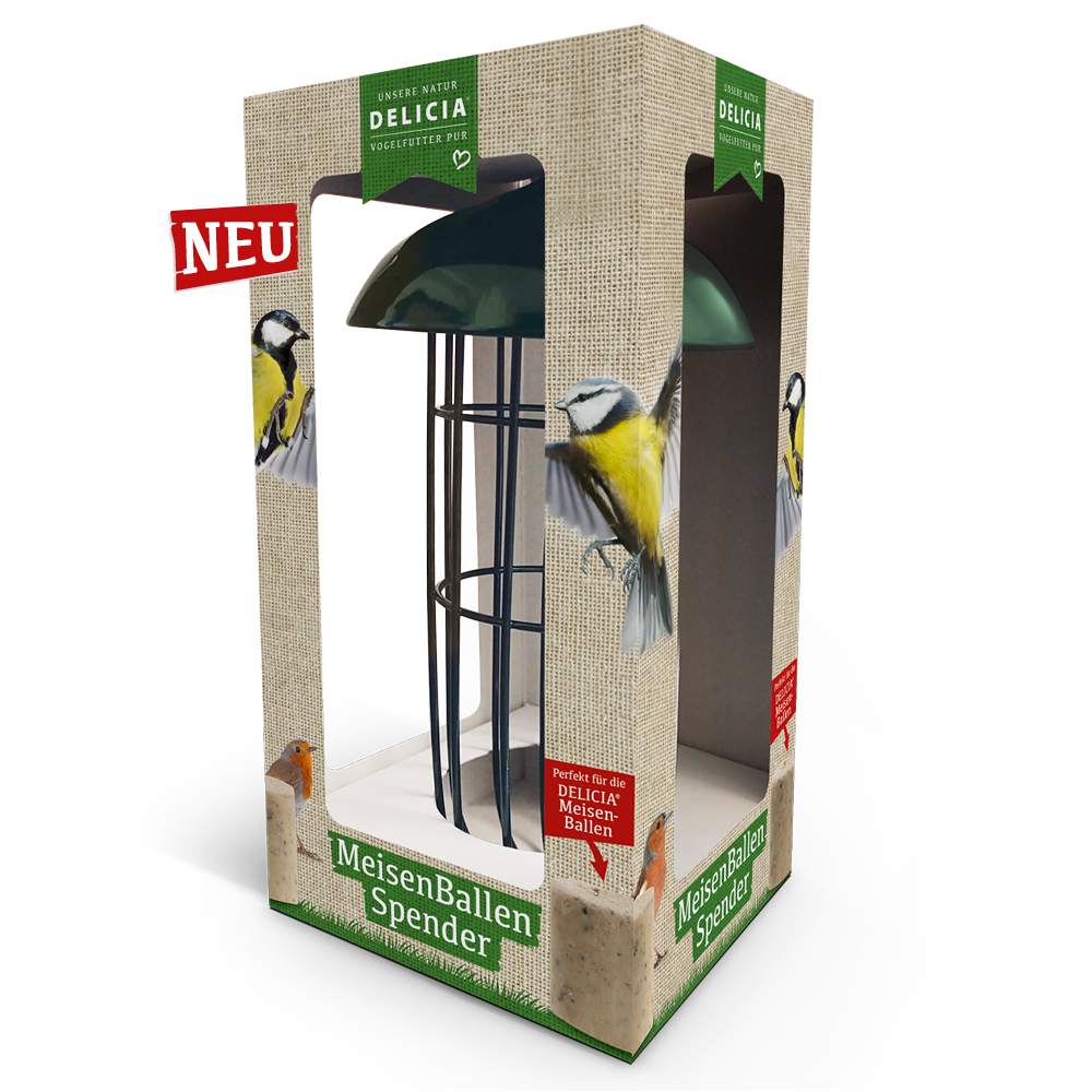 Erfreuen Sie sich ganzjährig an dem Besuch Ihrer Gartenvögel. Der speziell etwickelte Delicia® MeisenBallen Spender lässt sich überall ganz leicht anbringen. Ob im Garten, auf dem Balkon oder der Terasse, gefüllt mit den Premium Meisenballen haben die kleinen Freunde besonders vile Pick- und Kletterspass.