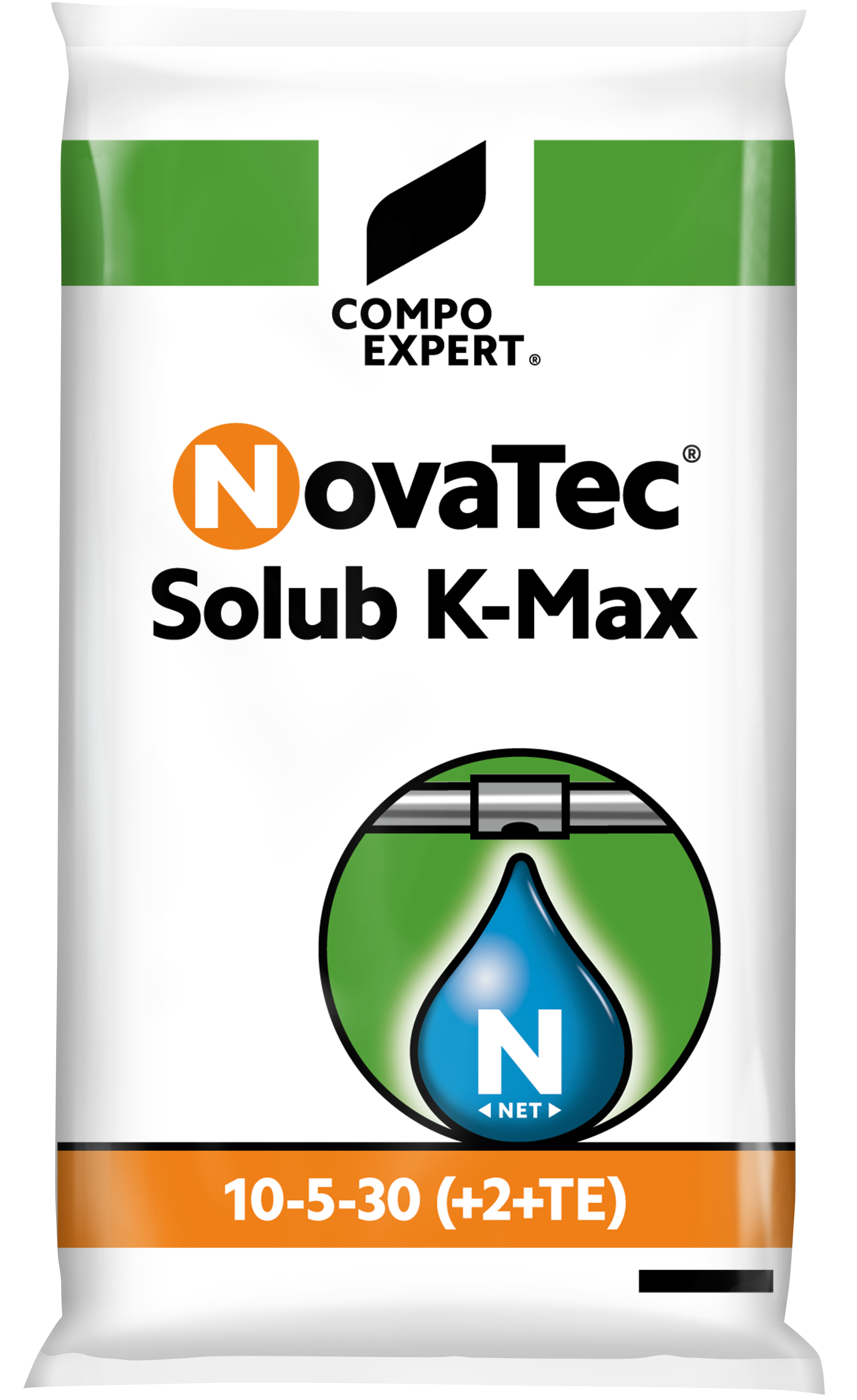 NovaTec Solub K-Max ist ein NPK-Dünger mit Magnesium, mit Nitrifikationshemmstoff 3,4-Dimethyl-1H-pyrazolphosphat (DMPP) mit Bor, Kupfer, Eisen, Mangan, Molybdän, Zink.