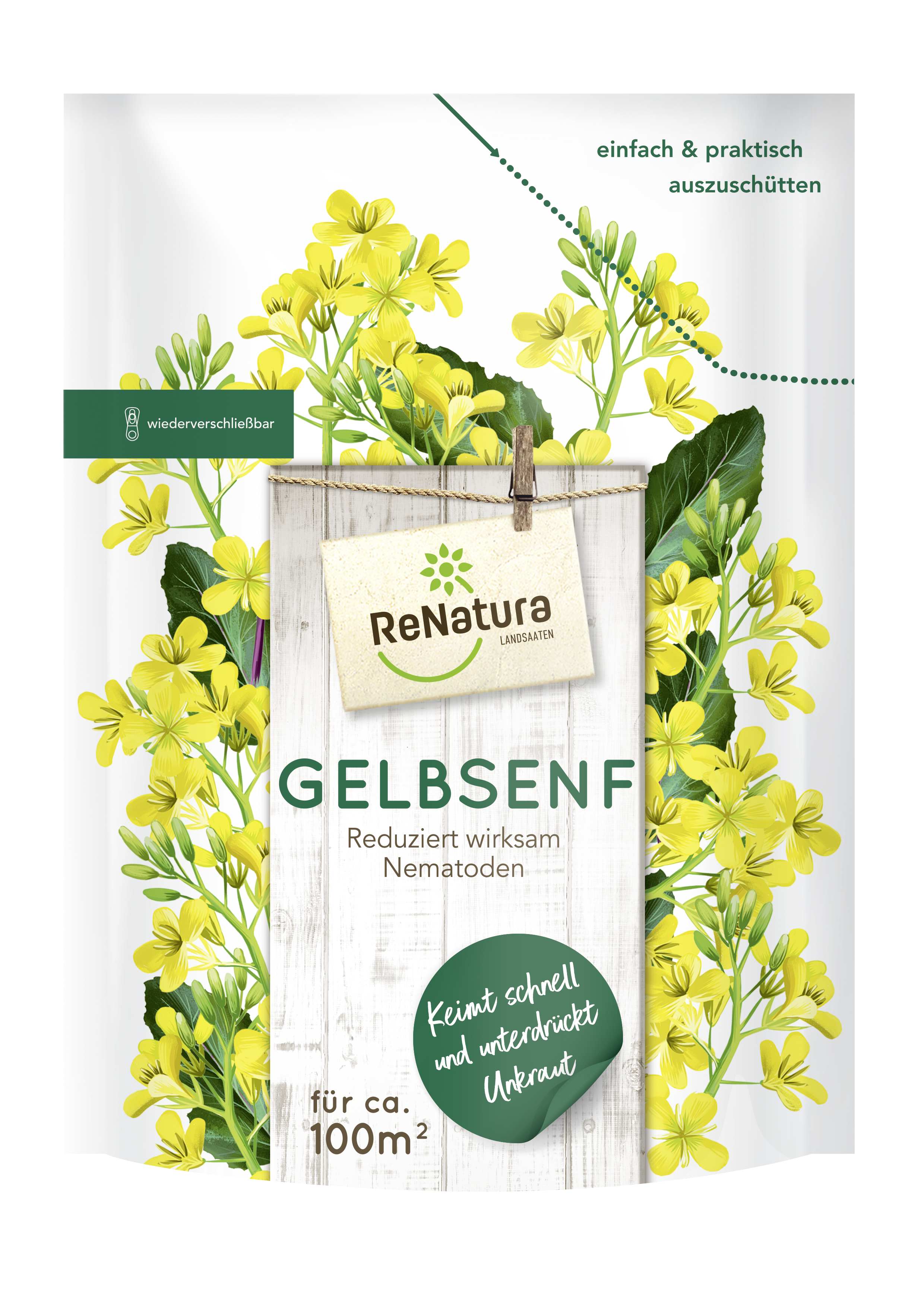 Der Bio Gelbsenf von ReNatura® ist eine klassische Gründüngungspflanze. Er keimt sehr schnell, bedeckt den Boden und friert im Winter ab. Gelbsenf eignet sich auch ausgezeichnet für die Mulchsaat. Zur Gründüngung die Pflanzen untergraben oder die Grünmasse kompostieren. Durch den nematodenresistenten Gelbsenf lässt sich das Vorkommen von schädlichen Rübenzystennematoden deutlich verringern. Durch die Veränderung des Geschlechterverhältnisses bei den Nematoden wird die Fortpflanzung erheblich gestört und die Population nimmt deutlich ab.