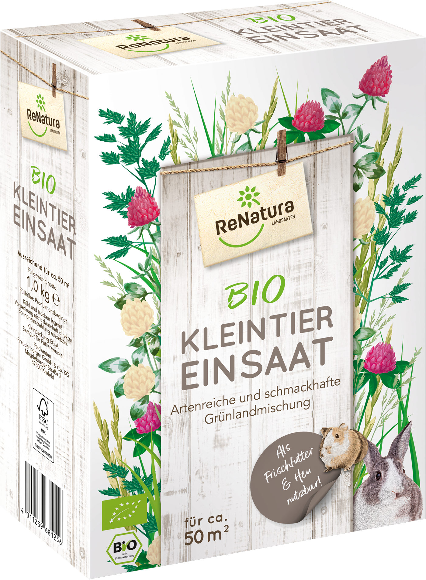 Die Bio Kleintiereinsaat von ReNatura® ist eine für alle Böden geeignete Mischung wertvoller Futterpflanzen. Sie enthält Rotklee, Weißklee und Futtergräser in einem ausgewogenen Verhältnis und eignet sich sehr gut sowohl zur Frischfütterung als auch zur Heugewinnung. Hochwertiges Futter bildet eine gute Ernährungsgrundlage und fördert die Tiergesundheit. Der enthaltene Klee hat einen hohen Proteingehalt und sorgt für eine optimale Eiweißversorgung der Kleintiere. Auch viele Insekten und Nutzinsekten, wie Bienen und Hummeln, profitieren von der Mischung und finden in dem Aufwuchs Lebensraum und Nahrung.
