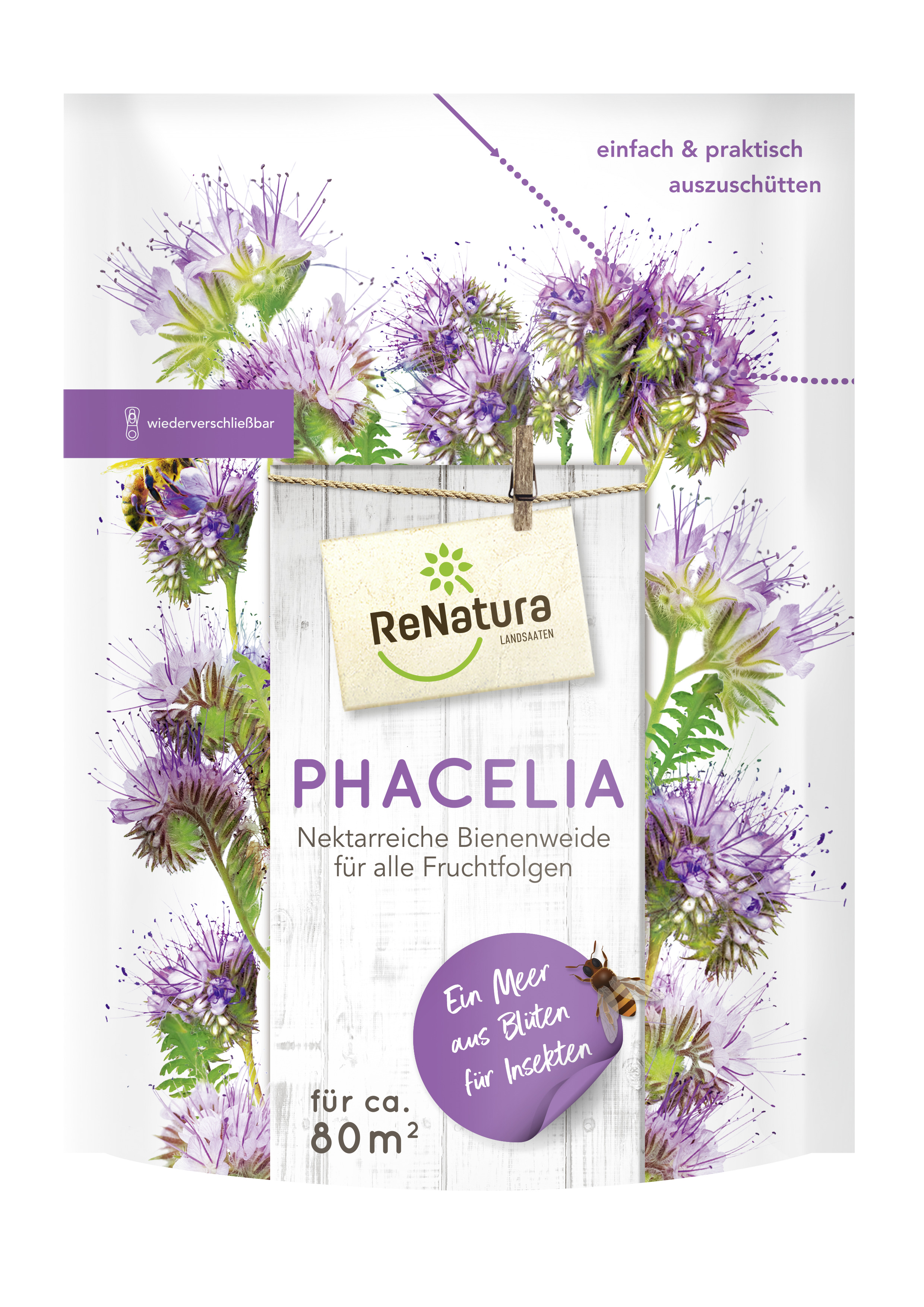 Phacelia, auch Bienenweide oder Büschelschön genannt, ist eine blau-violett blühende Blühpflanze, die eine enorme Anziehungskraft auf pollen- und nektarsammelnde Insekten hat und von diesen während der Blüte sehr gerne aufgesucht wird. Phacelia ist mit keiner landwirtschaftlichen Art enger verwandt und kann deshalb problemlos in alle Fruchtfolgen integriert werden. Sie eignet sich hervorragend als Zwischenfrucht und geht schon nach wenigen Wochen in die Blüte.