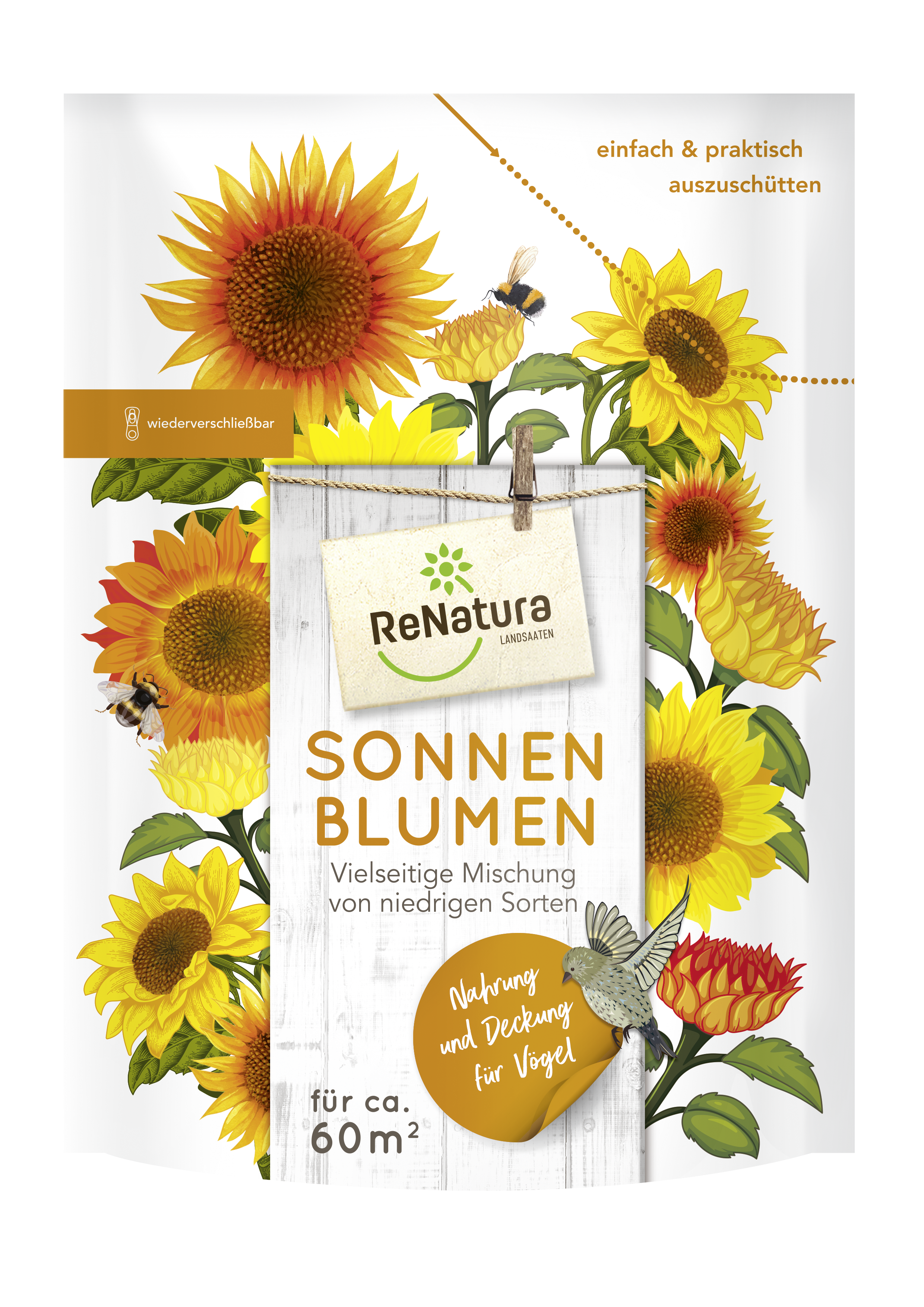 Die Sonnenblumen von ReNatura® zeichnen sich durch ihre gelb- und orangeleuchtenden Blüten aus. Durch die Verwendung mehrerer Sorten entsteht eine Mischung mit unterschiedlichen Blütenfarben und -größen. Die Sonnenblumen werden während der Blüte besonders gerne von Hummeln angeflogen und die Samen dienen später als Nahrung für viele Vogelarten und Nagetiere. Werden die Sonnenblumen über den Winter hinweg stehen gelassen, bieten diese auch in der kalten Jahreszeit einen beliebten Lebensraum und vor allem eine Nahrungsquelle für Gartenvögel.