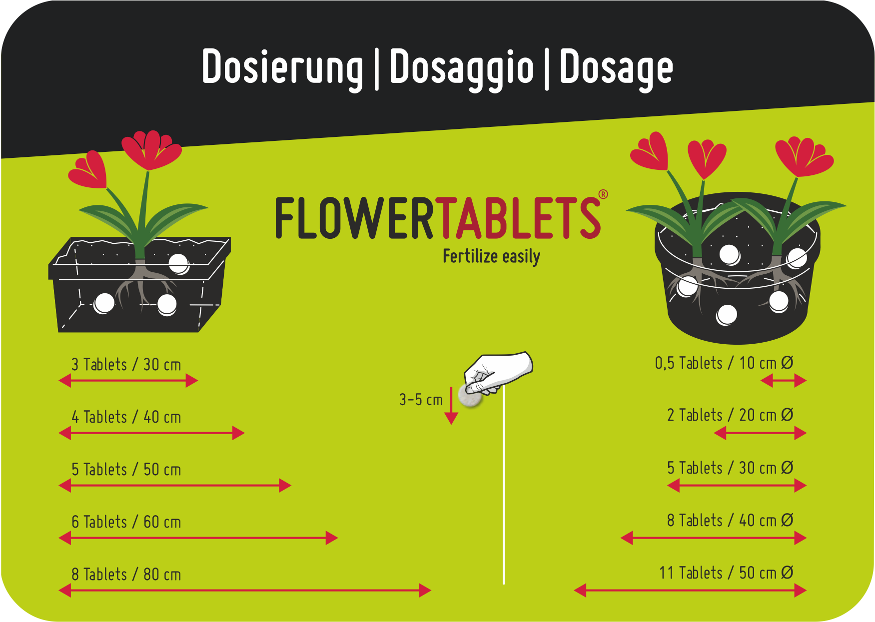 Nach ca. 10 Tagen beginnen die Flowertablets die Nährstoffe freizusetzen, versorgen so Ihre Blumen und Pflanzen über mehrere Wochen mit allen wichtigen Haupt– und Spurennährstoffen, und sorgen für kräftiges Wachstum und Blütenbildung.