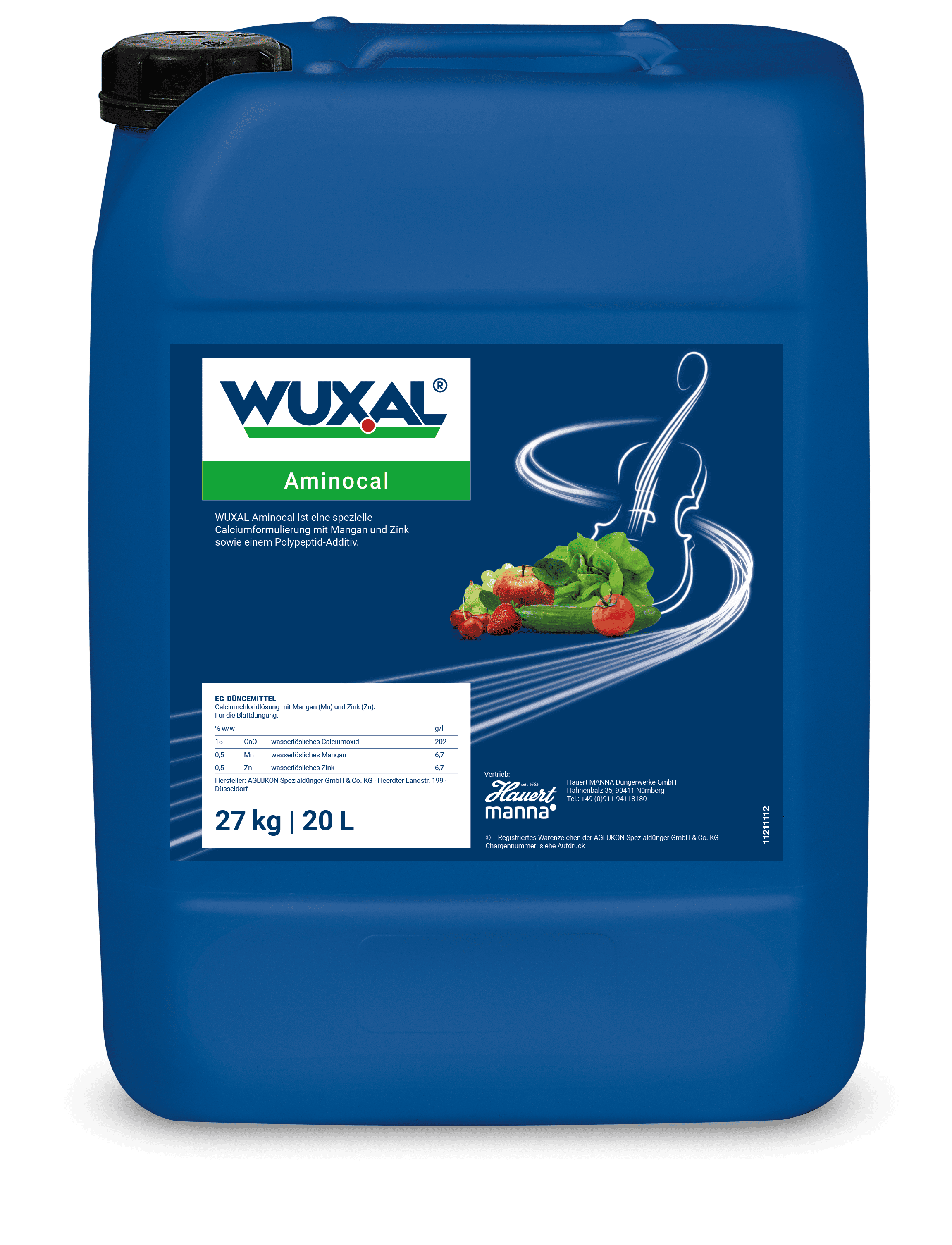 WUXAL Aminocal ist eine spezielle Calcium-Formulierung. Sie enthält neben den Spurenelementen Mangan und Zink ein natürliches Polypeptid-Additiv. Das Molekulargewicht dieses Polypeptid-Additivs ist auf ein mittleres Gewicht eingestellt. So senkt es die Oberflächenspannung, verstärkt dadurch die Netzwirkung und es führt zu einer verbesserten Haftwirkung. Mittelkettige Polypeptide werden langsam über die Blätter und die Früchte in die Pflanze aufgenommen.