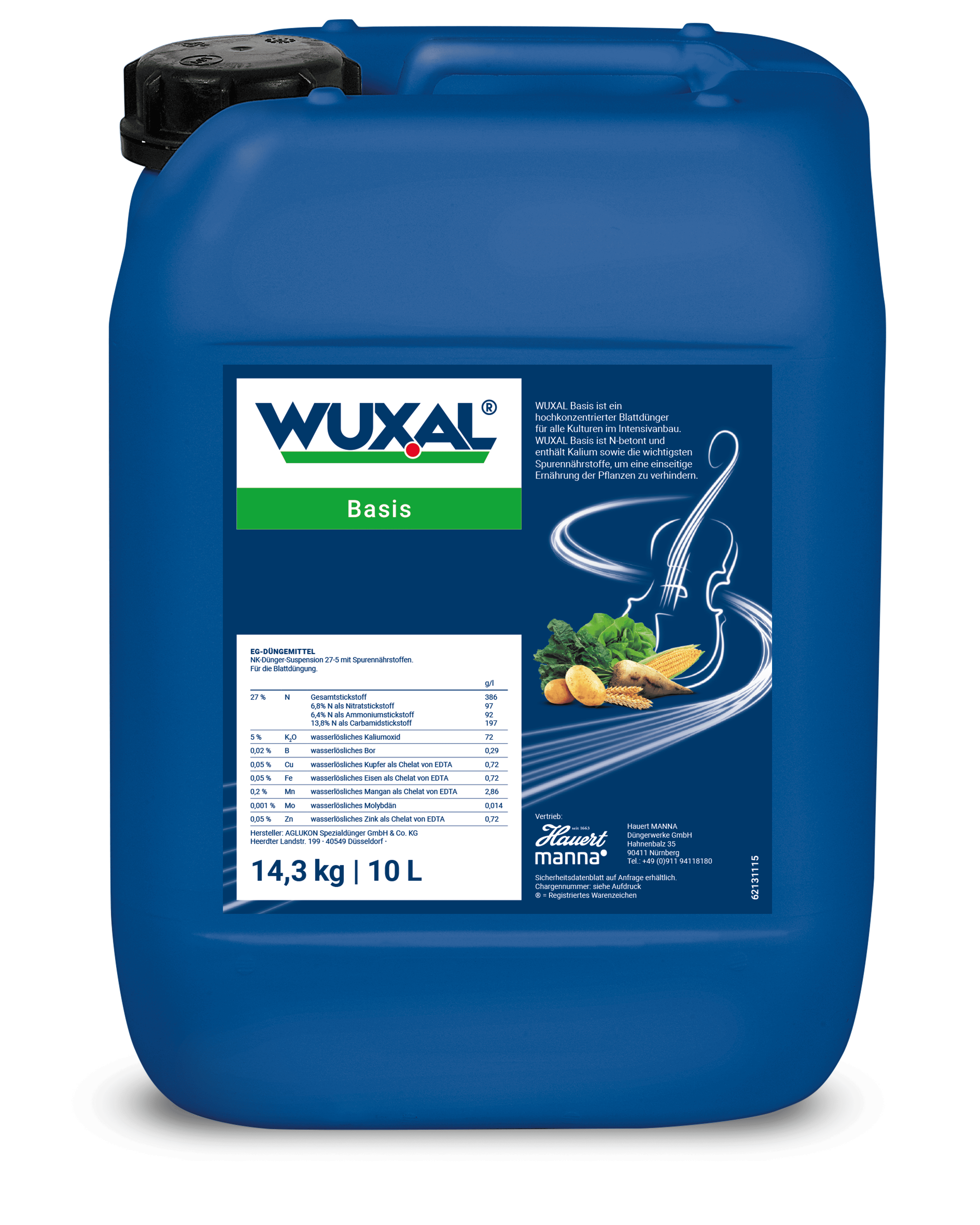 WUXAL Basis ist eine hochkonzentrierte NK-Dünger-Suspension mit Spurennährstoffen für alle Kulturen im Intensivanbau. Ein Blattdünger für den Einsatz in Sonderkulturen, Gartenbau, Gemüsebau und in Landwirtschaftlichen Kulturen. 27 % N, 5,0 % K₂O. WUXAL Basis ist in der Zusammensetzung stickstoffbetont, enthält Kalium und die wichtigsten Spurennährstoffe in einer ausgewogenen Zusammensetzung. Damit ist WUXAL Basis ideal für eine bedarfsgerechte