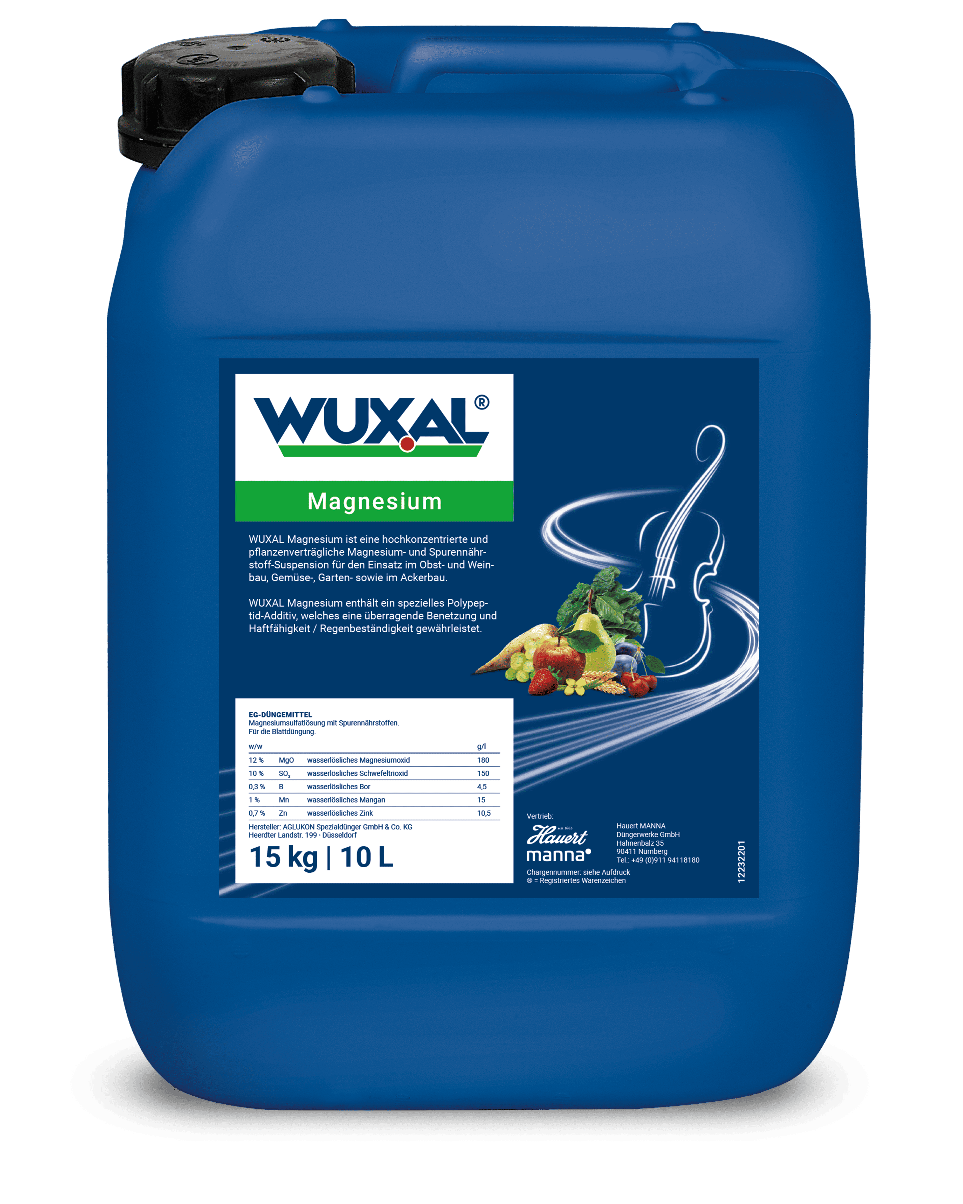 WUXAL Magnesium ist eine Kristall-Suspension mit hohem Magnesiumgehalt und den Spurenelementen Bor, Mangan und Zink. 12 % MgO, 0,3 % B, 1,0 % Mn und 0,7 % Zn. WUXAL Magnesium ist ist entwickelt worden, um Pflanzen mit einem hohen Magnesiumbedarf schnell und effektiv über die Blätter und die Pflanzenteile mit Magnesium zu versorgen. WUXAL Magnesium deckt ideal den Bedarf von Kulturen wie z.B.: Kernobst, Steinobst, Weinrebe, Kartoffel, Zuckerrübe, Gemüse oder