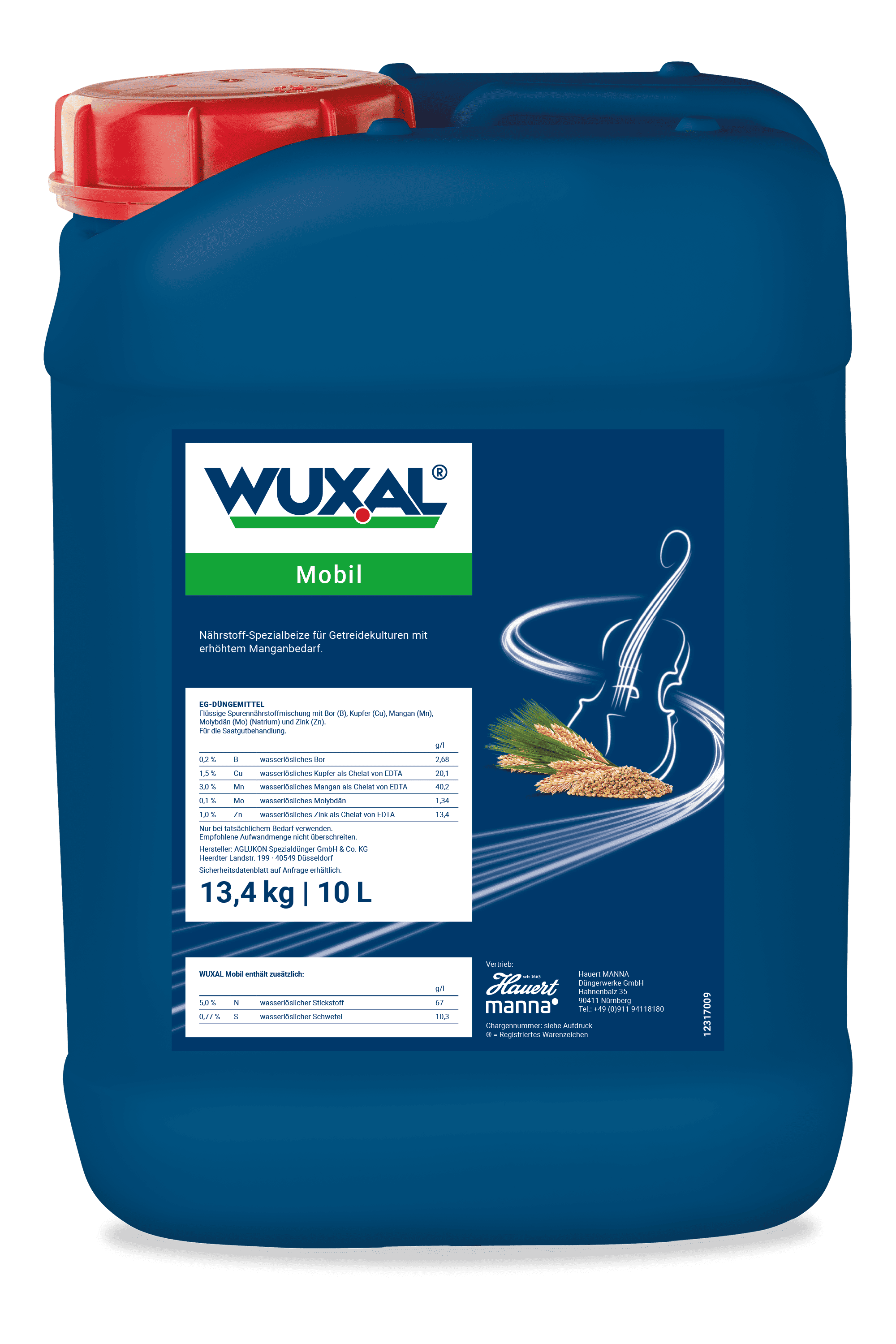 WUXAL Mobil ist eine Mikronährstoffsuspension zur Beizung von Saatgut. Sie enthält B, Cu, Mn, Mo, Zn, N und S. Die spezielle Komposition von WUXAL Mobil zielt auf die Ernährung von Getreidejungpflanzen mit erhöhtem Mn Bedarf ab (Weizen, Gerste, Hafer). Außerdem eignet sie sich für den Anbau auf Böden mit geringer Mn Verfügbarkeit.