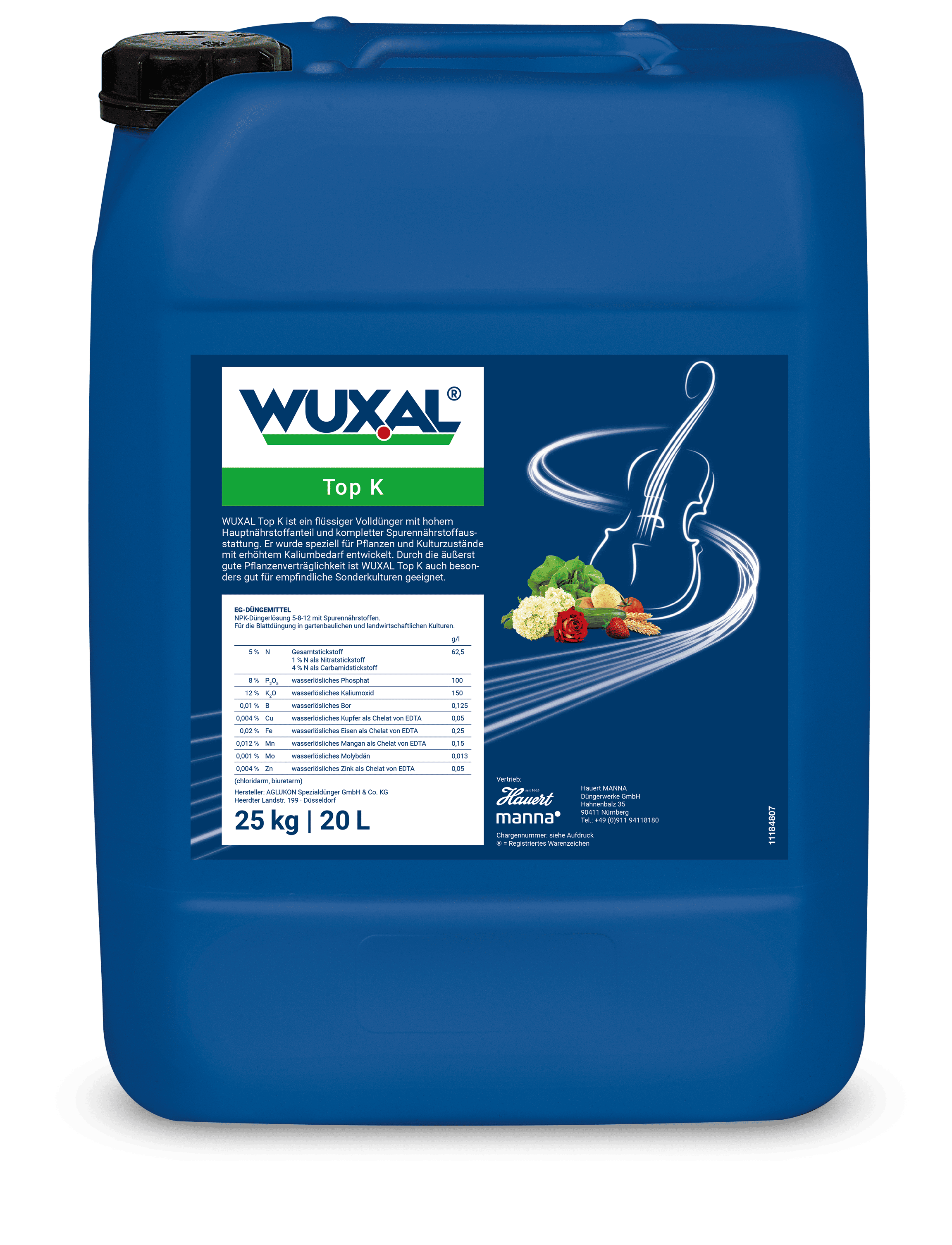 WUXAL Top K ist ein flüssiger NPK-Dünger 5-8-12 mit Spurennährstoffen zeichnet sich durch eine außerordentlich hohe Pflanzenverträglichkeit aus und ist damit besonders geeignet für den Einsatz in hochwertigen und empfindlichen Kulturen. WUXAL Top K ist sowohl über den Boden, als auch über das Blatt anwendbar. Ein intelligentes Puffersystem stellt den pH-Wert der Lösung in einem Bereich von 6 –6,5 ein. Die Überchelatisierung des Produkts vermindert bei Blatt-behandlung, auch wenn hartes Wasser eingesetzt wird, die Entstehung von Blattflecken.