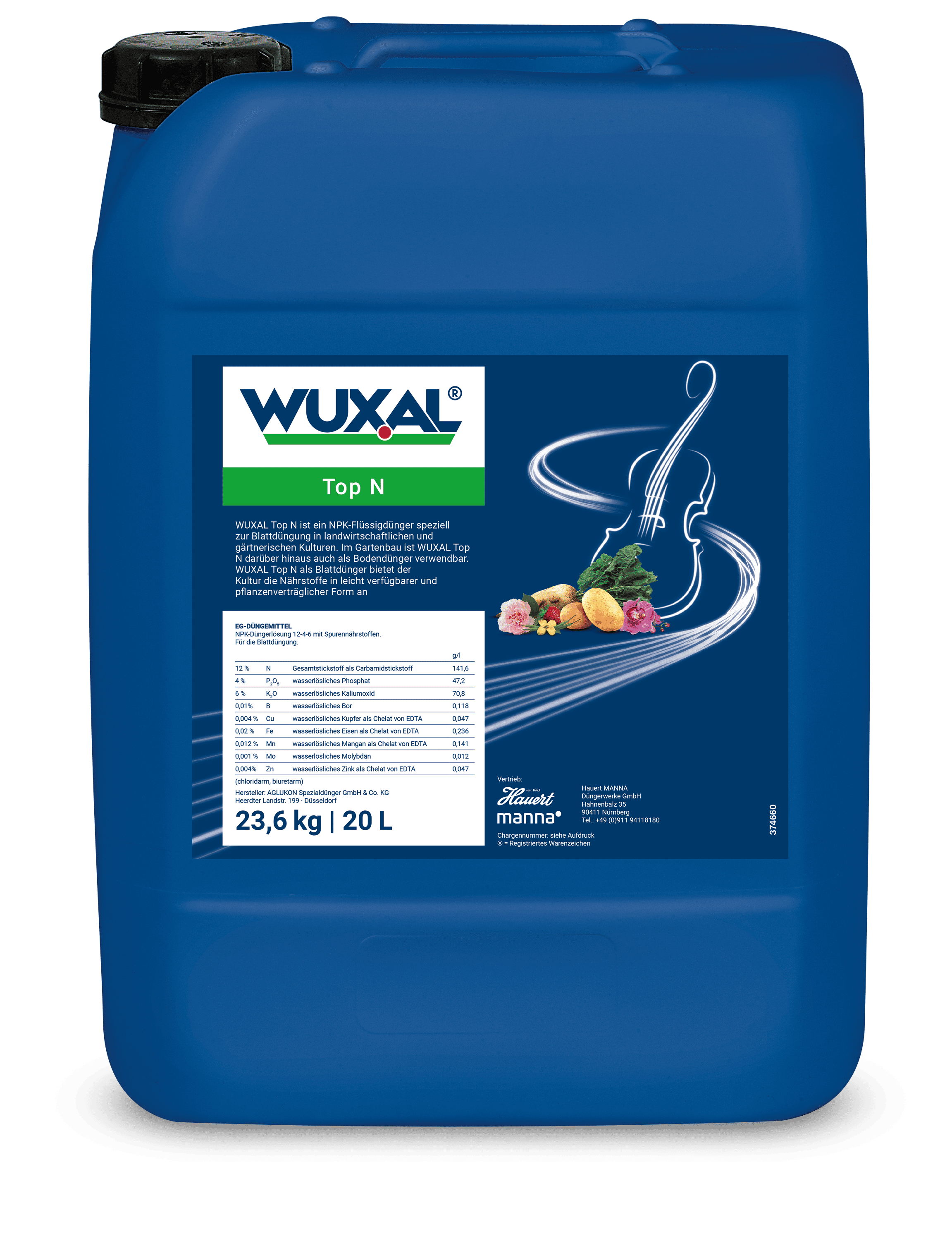 WUXAL Top N ist ein flüssiger NPK-Dünger 12-4-6 mit Spurennährstoffen zeichnet sich durch eine außerordentlich hohe Pflanzenverträglichkeit aus und ist damit besonders geeignet für den Einsatz in hochwertigen und empfindlichen Kulturen. WUXAL Top N ist sowohl über den Boden, als auch über das Blatt anwendbar. Ein intelligentes Puffersystem stellt den pH-Wert der Lösung in einem Bereich von 6 – 6,5 ein. Die Überchelatisierung des Produkts vermindert bei Blattbehandlung, auch wenn hartes Wasser eingesetzt wird, die Entstehung von Blattflecken.